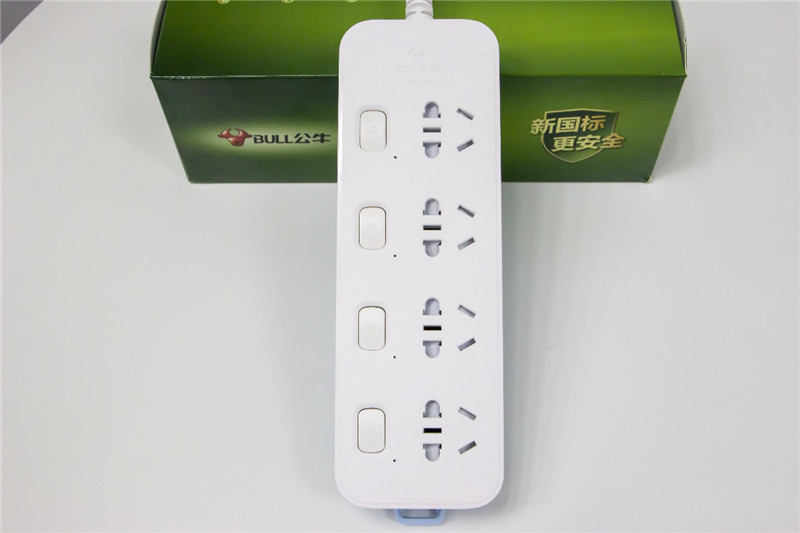 公牛綠色包裝的延長線插座沒有USB插口,四個白色按鈕一字排開分別控制相對應的電源插口。