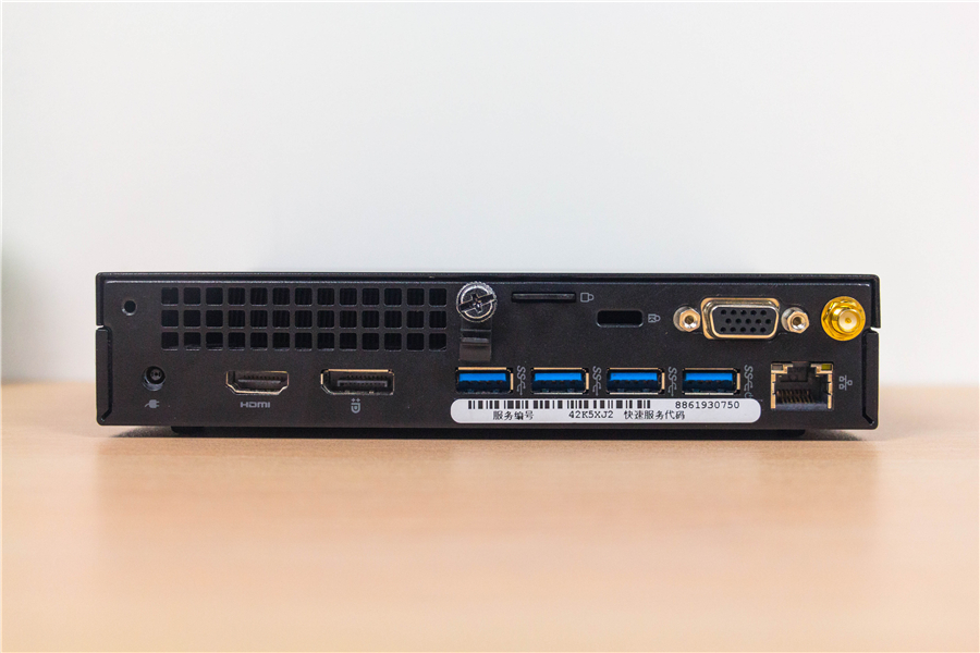 背面的I/O面板也是臺式機級別的:一個無線網卡天線位、一個RJ45網口、4個USB 3.0 Type-A接口、兩個設備鎖口、電源接口、以及VGA、HDMI和DP視頻輸出接口——OptiPlex 7050可以支持三聯屏。