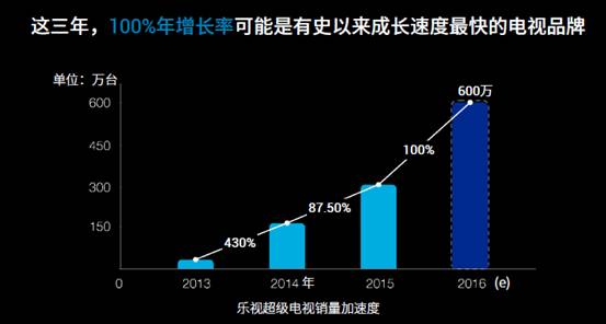 2014年樂視超級電視銷售150萬臺,2015年銷售300萬臺,而今年目標600萬臺如果順利完成,在中國整個電視行業,樂視超級電視每年100%的增長率可能是有史以來成長速度最快的電視品牌。