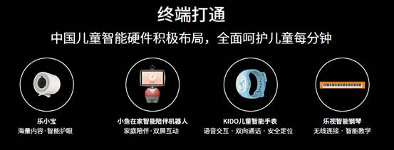 終端打通:圍繞家庭教育場景,很多智能終端產品加入到樂視兒童所打造的家庭大屏教育生態,如樂小寶、小魚在家智能陪伴機器人、KIDO兒童智能手表、樂視智能鋼琴等。