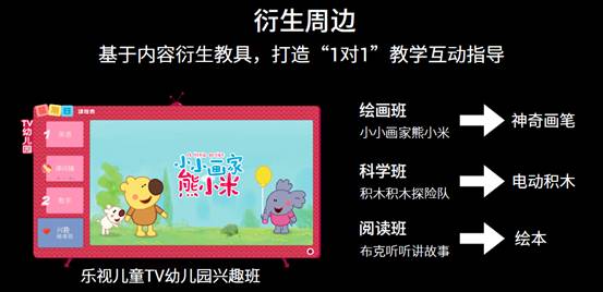 成為大屏教育家庭標配的樂視兒童,也引來生態合作伙伴的積極參與,這主要體現在內容生態、終端打通、衍生品、線下布局四個方面: