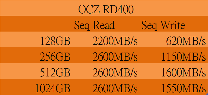 NVMe產(chǎn)品的高速讀寫速度是目前SATA和PCIe儲存裝置所無法比擬的,因此也是未來趨勢之一,現(xiàn)在Toshiba OCZ正式發(fā)表RD400 NVMe SSD,為M.2 2280尺寸,透過轉(zhuǎn)卡可變?yōu)镻CIe SSD卡樣貌使用。因此雖然M.2接口產(chǎn)品但出廠有分為附PCIe轉(zhuǎn)接卡版本和M.2版本可選,使用者可以選擇插于PCIe插槽或是M.2插槽使用,走PCIe 3.0 X4帶寬,容量有128/256/512/1024GB可選,控制器為Toshiba TC58NCP,搭配Toshiba 15nm MLC顆粒,并且加上內(nèi)存當作快取使用,依據(jù)容量不同讀寫速度將會有差異,其中以512GB效能最好,1024GB寫入效能會下降一些,讀取速度256GB后都能達到2600MB/s,若是筆者挑選購買會容量順序會是512GB>1024GB>256GB>128GB。