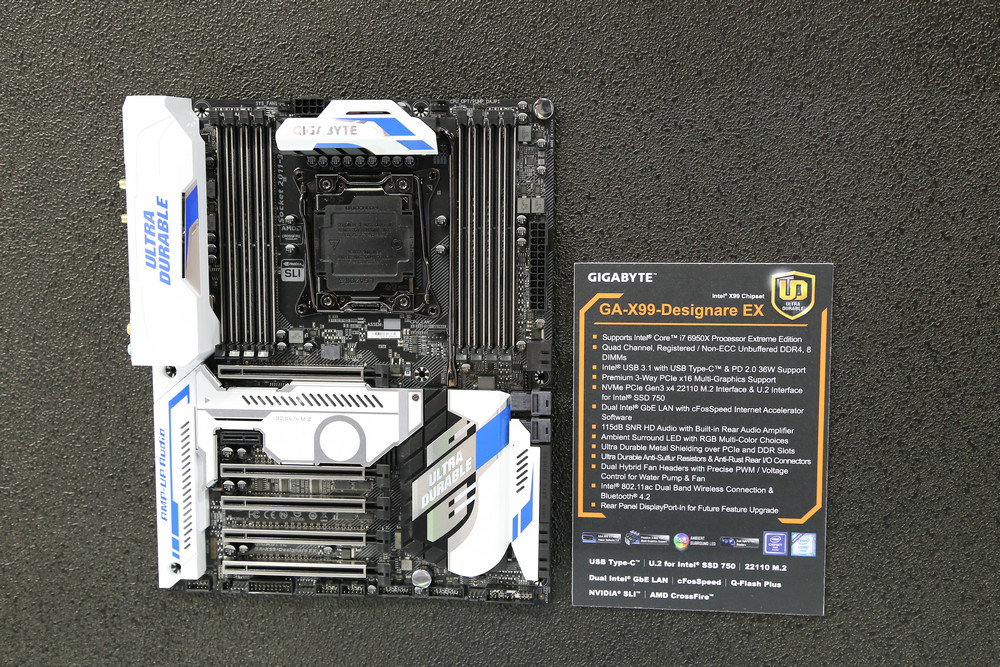 此次COMPUTEX 2016上,技嘉展出了針對設計師推出的全新Designare系列主板產品,主板采用ATX版型, IR數字供電設計,并擁有5條PCI-E插槽,支持3路PCI-E x16多卡互聯。板載的雙U.2接口,支持NVMe技術,可提供高達32Gb/s的帶寬遠超傳統SATA接口。為應對高性能平臺所產生的發熱量,主板還采用了混合動力散熱接口設計,以此獲得高效、穩定的工作環境。當然還有雷電3、雙千兆網卡、出色的魔音音頻系統、802.11ac無線、藍牙4.2等高規格配置。主板上眾多的RGB LED燈效布局,可以隨心所欲的去定制顏色,增加了不少可玩性。