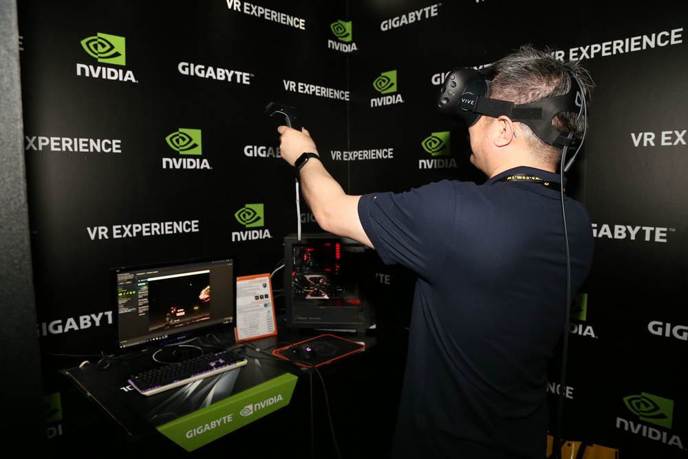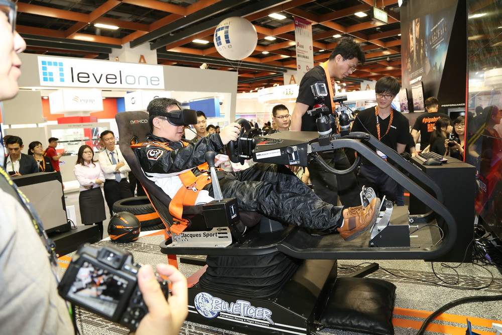 現場還有一大亮點,則是技嘉在展位與NVIDIA聯合推出VR的賽車體驗區,觀眾可以穿上賽車服通過VR設備獲得360°全景的視覺效果,液壓懸掛模擬駕駛座更能讓玩家體驗真實賽車所帶來的速度與激情。
