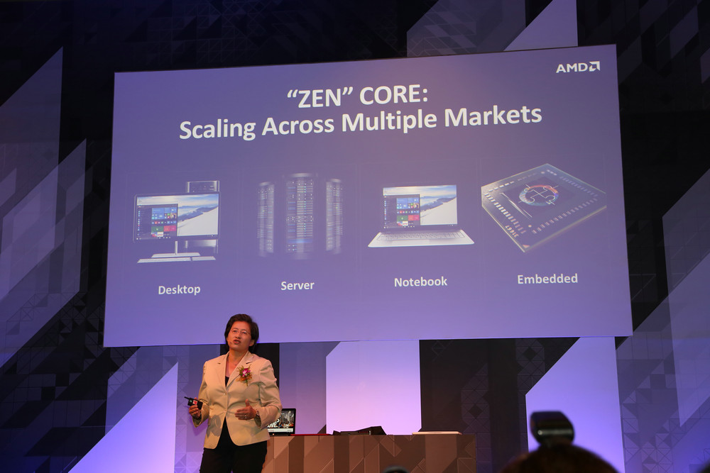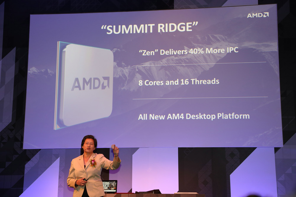 發布會現場AMD總裁兼首席執行官Lisa Su,為在場嘉賓展示了AMD強大的ZEN架構處理器,產品采用了14nm工藝,基于八核十六線程設計,支持AMT超線程技術,資料顯示產品相對于現有產品效能提升多達40%,同時,AMD的“ZEN”核心也將廣泛的運用到高性能臺式機、服務器、筆記本和嵌入式系統等眾多市場,并計劃率先應用在代號為“Summit Ridge”的高性能臺式機處理器中。