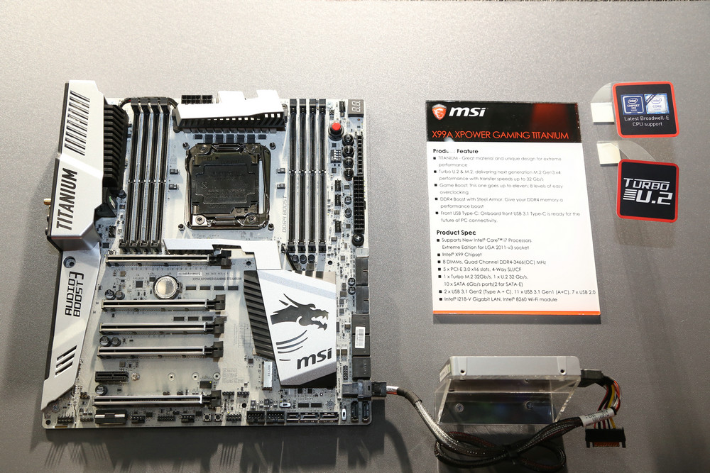 MSI X99A XPOWER GAMING TITANIUM超頻主板結合MSI獨家鈦金電路板強化設計以及第五代軍規料件,他不僅是極限效能的代名詞,可靠度及亮眼外觀也毫不遜色。主板搭載優異的超頻效能、最新的U.2 32Gb/s傳輸接口、USB 3.1 Gen 2 A+C、4-Way NVIDIA® SLI & AMD® CrossFire技術、完整I/O音效金屬屏蔽等多項關鍵超頻要素,X99A XPOWER GAMING TITANIUM已經準備好呈現最佳超頻效能及令人屏息的VR體驗。