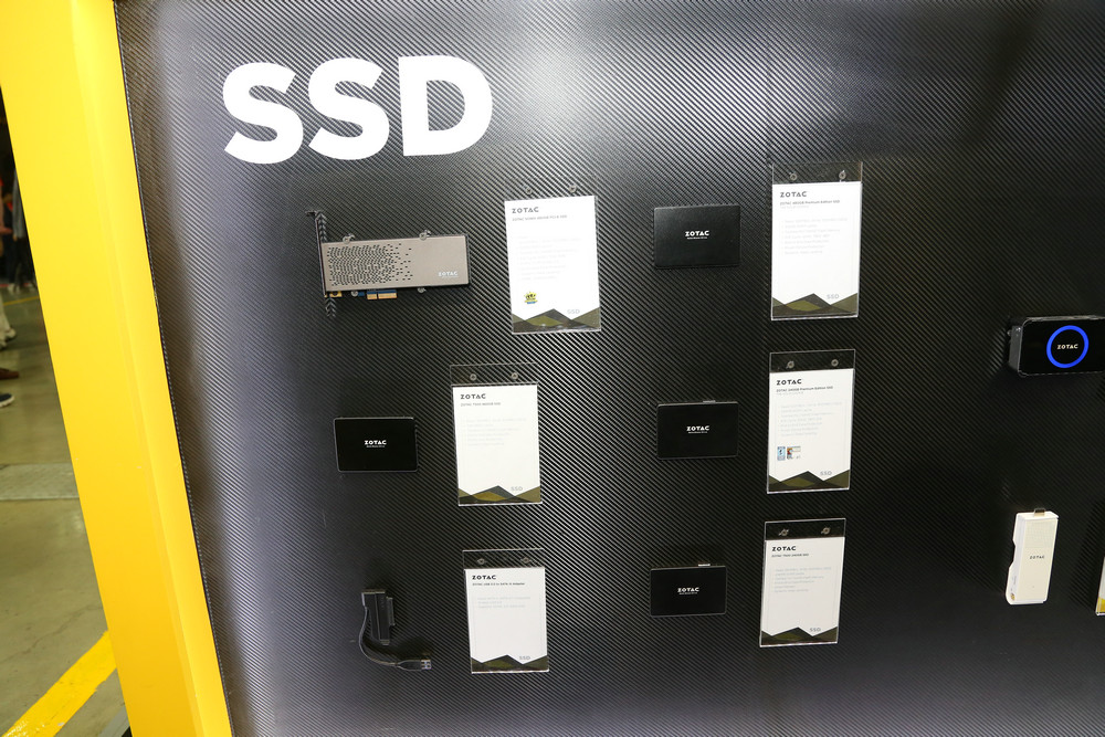 除此之外,現場在ZBOX mini PC旁還展出了眾多SSD,其中還包括了SONIX PCI-E SSD在內的多款SSD靜態展示,其中SONIX PCI-E 480GB SSD這款產品采用群聯PS5007-E7主控搭配東芝MLC閃存,配備512MB DDR3緩存,支持NVMe 1.2,采用PCI-E 3.0 x4接口,最大連續讀寫速度可達2600/1300 MB/s,MTBF可達2,000,000小時。