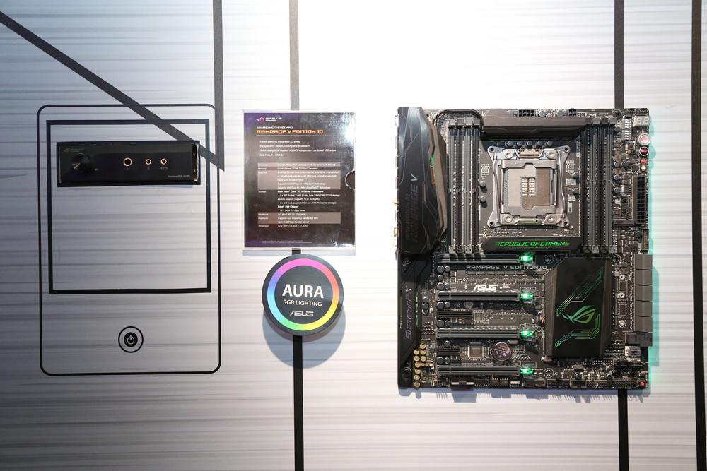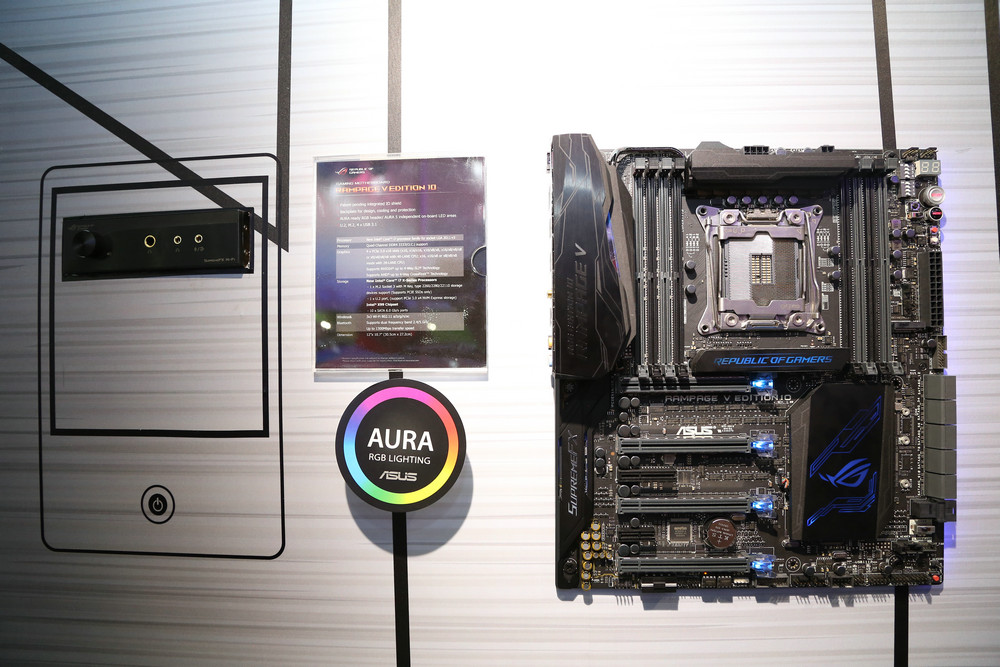 在現場還展出了ROG Rampage V Edition 10系列主板,其采用“全新的”X99芯片組設計(支持英特爾Skylake酷睿i7處理器--LGC 2011-v3插槽。