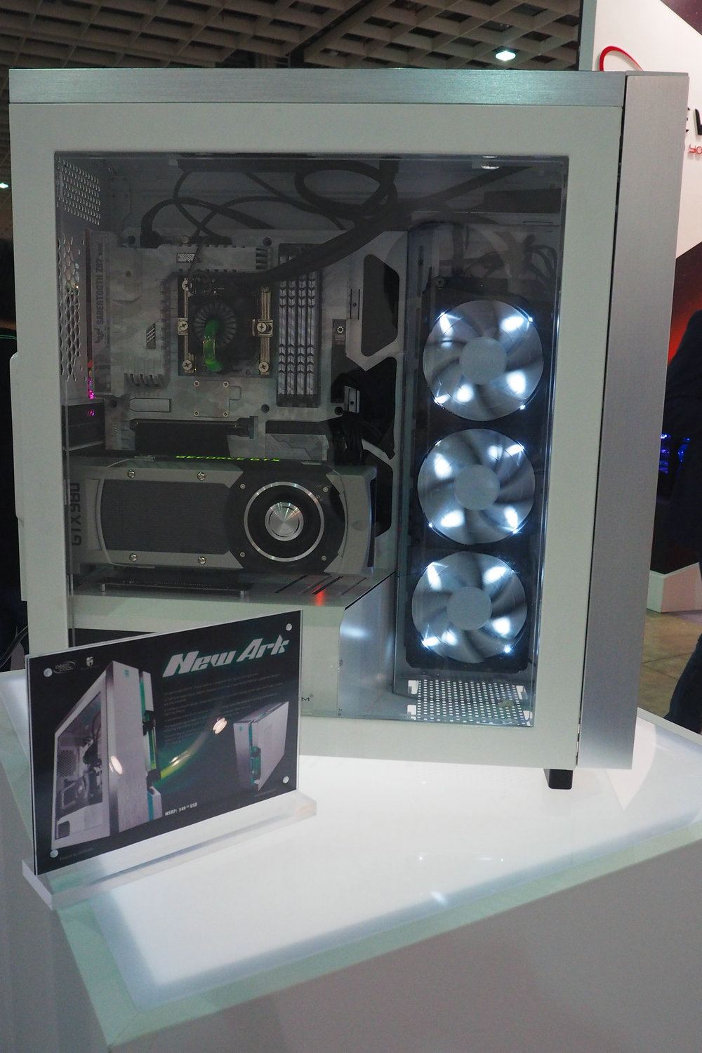 現場展出了一款全金屬機身的主機,設計較為簡單,但強調華麗背光、靜音降噪以及擴展