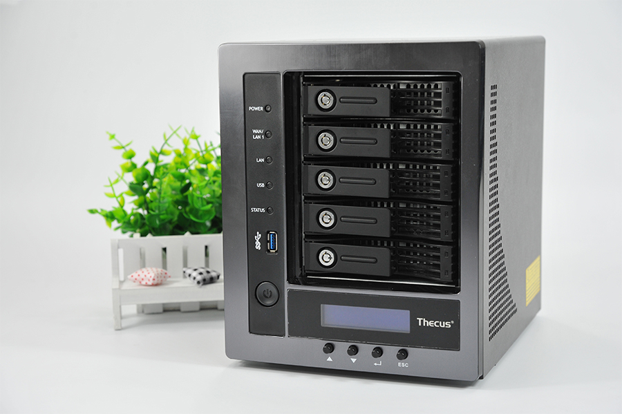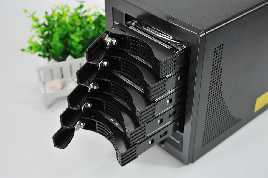 正面擁有1個(gè)USB 3.0接口,5個(gè)支持熱插拔的硬盤(pán)位