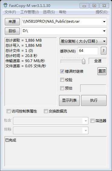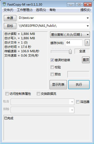 N5810 pro的功能十分全面,F(xiàn)TP,SSH,SNMP,VPN,UPnP等功能一個(gè)不少,畢竟作為一臺(tái)旗艦級(jí)NAS,擁有這些功能是理所當(dāng)然的。為了測(cè)試性能,我們用Fastcpy測(cè)試一下N5810 Pro在局域網(wǎng)SMB的傳輸數(shù)據(jù)。