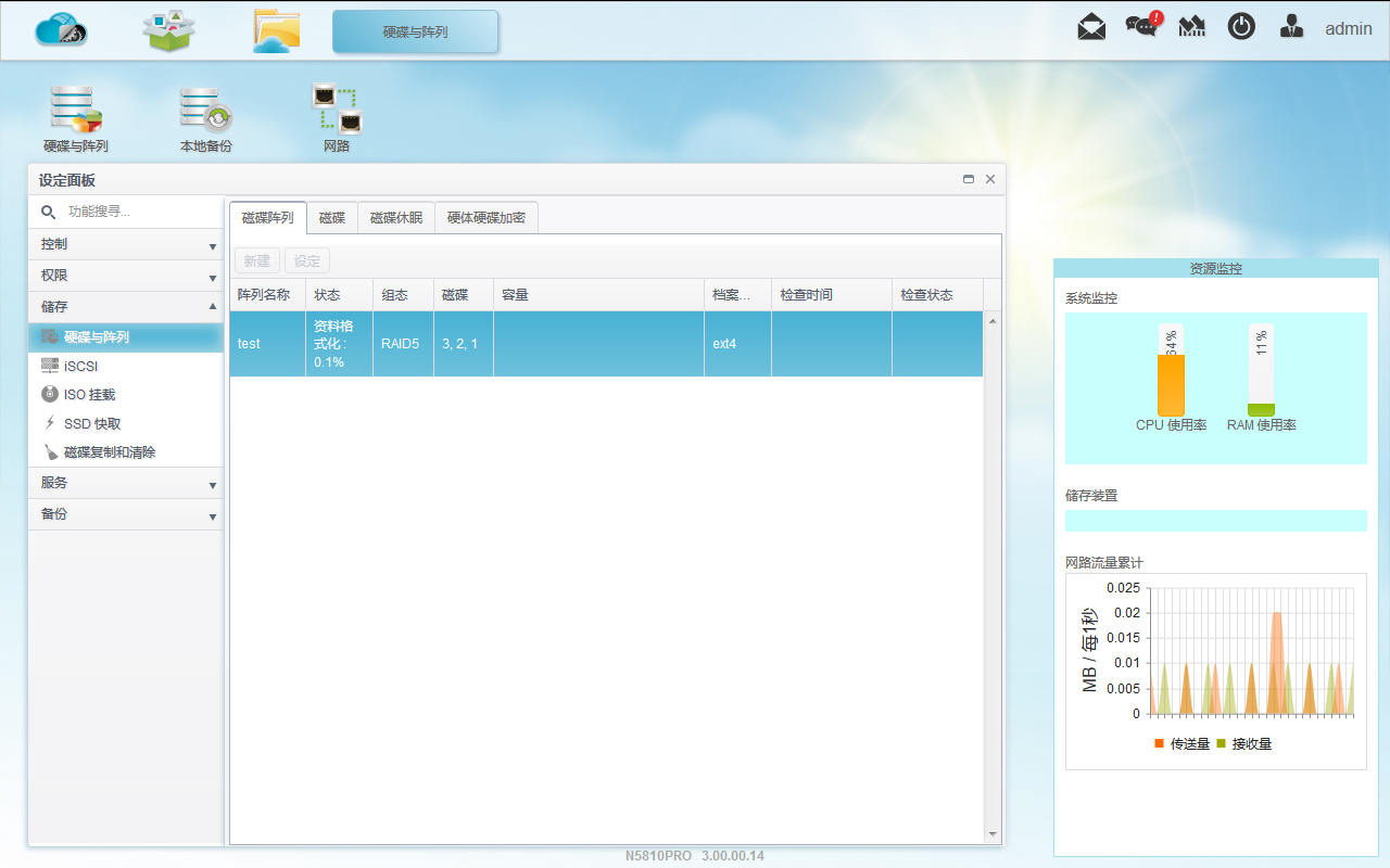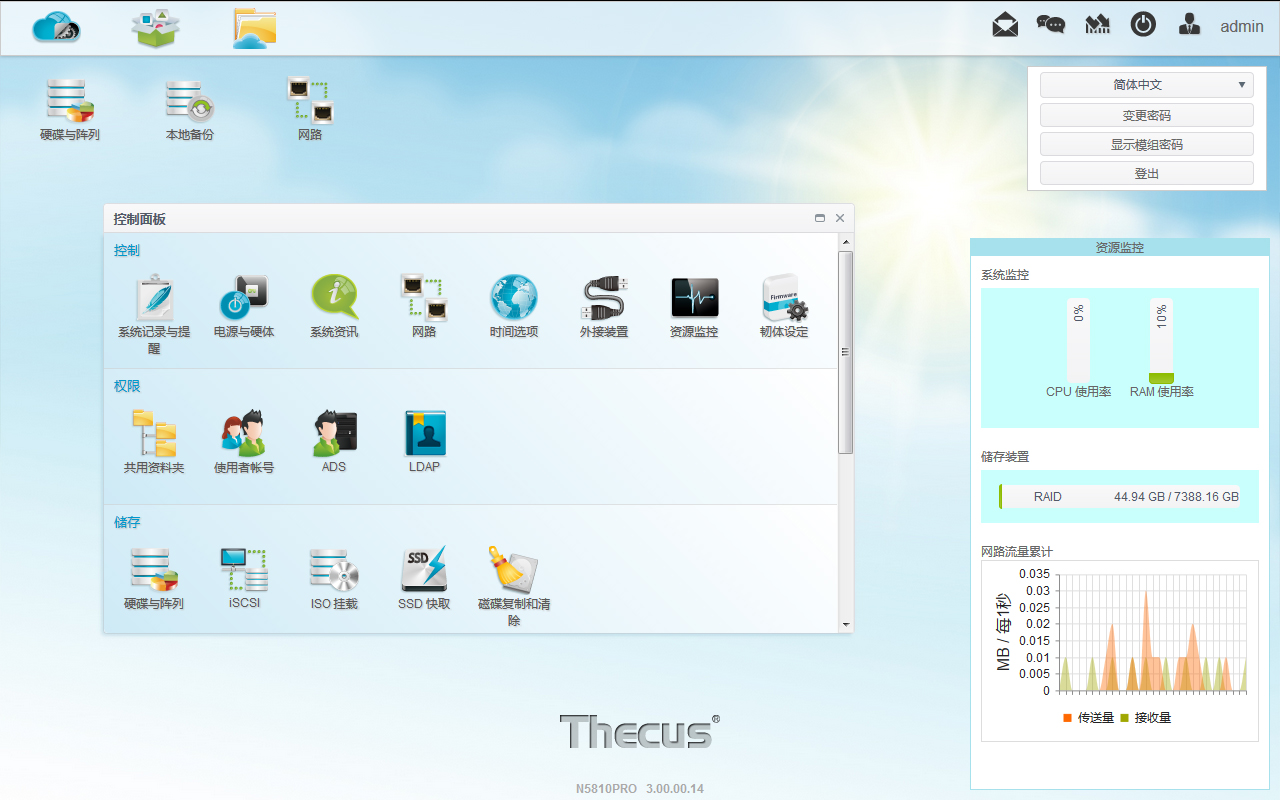 等RAID組建完成我們就可以開(kāi)始使用了,首先介紹一下系統(tǒng)設(shè)置,感覺(jué)N5810 Pro比較有特色的是系統(tǒng)監(jiān)控信息,可以看到硬盤(pán)的總讀取量和總寫(xiě)入量,還可以監(jiān)控NAS的CPU,內(nèi)存,硬盤(pán),網(wǎng)絡(luò)的實(shí)時(shí)情況。其次還支持網(wǎng)絡(luò)喚醒,對(duì)路由稍微設(shè)置還可以遠(yuǎn)程喚醒,非常方便。