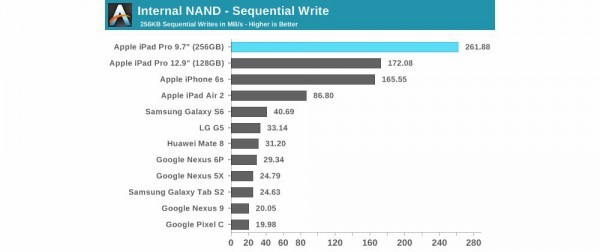9.7寸iPad Pro與12.9寸iPad Pro唯一區(qū)別很大的方面就是儲(chǔ)存性能,雖然讀取性能相差不多,但9.7寸iPad Pro的寫(xiě)入速度卻遠(yuǎn)超12.9寸iPad Pro。