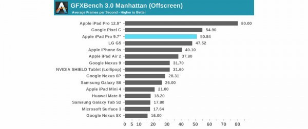 對(duì)于游戲性能,測(cè)量每秒幀數(shù)的測(cè)試顯示9.7寸iPad Pro與12.9寸iPad Pro差距很大。雖然通過(guò)測(cè)試軟件獲得的結(jié)果差別很大,但在實(shí)際使用中,兩臺(tái)設(shè)備差距并不大。這是因?yàn)樾〕叽鏸Pad Pro驅(qū)動(dòng)的屏幕像素也更少,所以實(shí)際使用體驗(yàn)相差不多。