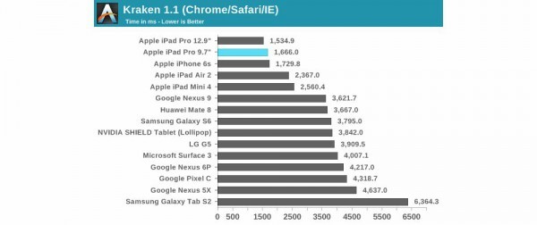 國(guó)外知名評(píng)測(cè)網(wǎng)站AnandTech終于發(fā)布了9.7寸iPad Pro詳盡評(píng)測(cè),AnandTech的產(chǎn)品評(píng)測(cè)耗時(shí)很長(zhǎng),但卻非常詳盡。在A(yíng)nandTech評(píng)測(cè)中,與9.7寸iPad Pro對(duì)比的設(shè)備包括:iPad Air 2 以及其他蘋(píng)果設(shè)備。雖然12.9寸iPad Pro的內(nèi)存為4GB,9.7寸iPad Pro的內(nèi)存為2GB,但在瀏覽器測(cè)試中,9.7寸iPad Pro與12.9寸iPad Pro的性能差別并不大。