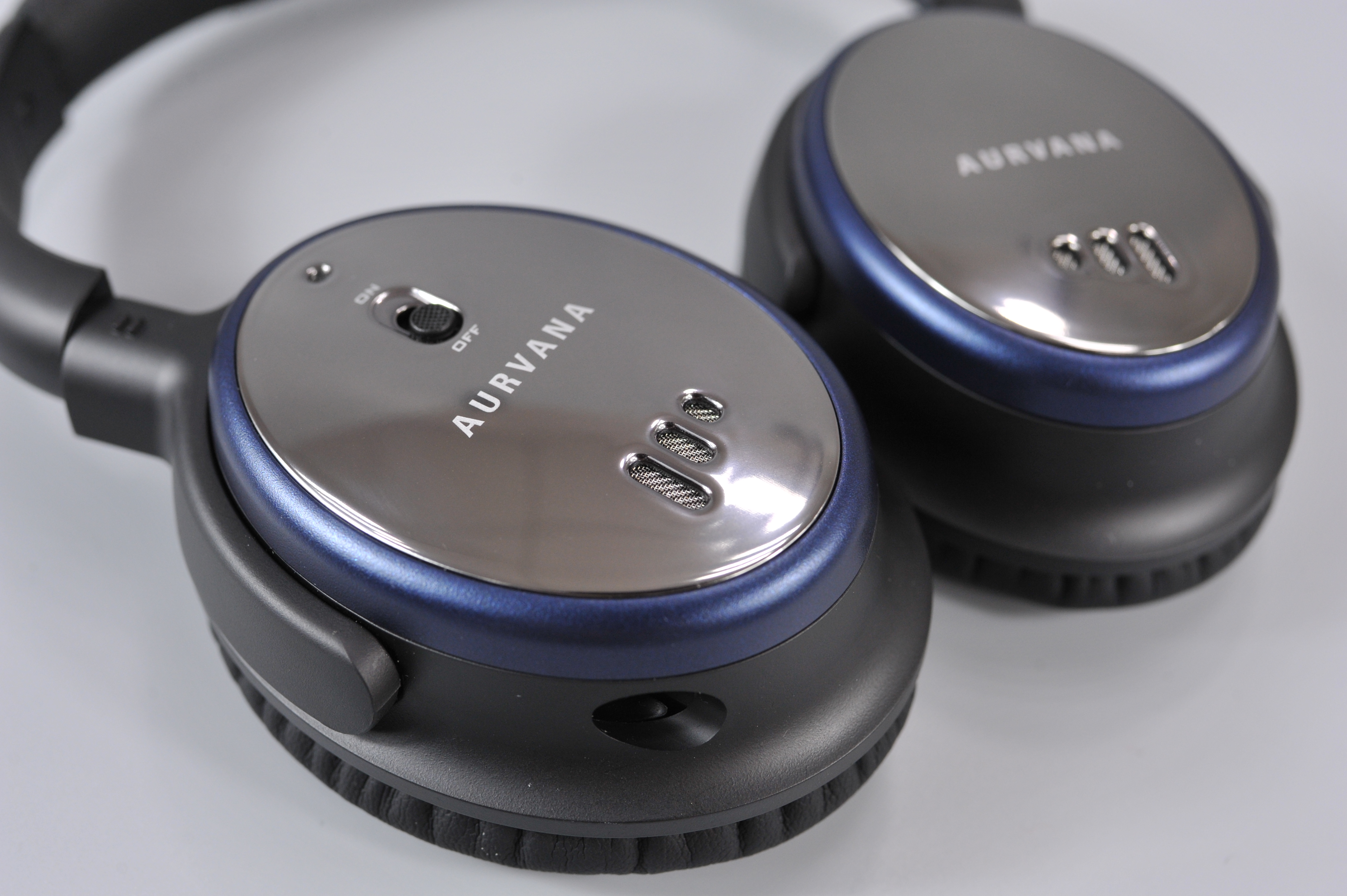 在左側耳罩上有一個主動降噪的開關,上面也有一個電源指示燈,標識電源開啟,右聲道耳罩外側則可以向左移開,便可以安裝電池了。而AURVANA的系列字樣下的則是兩個特殊的麥克風能拾取外部噪音并主動消噪。
