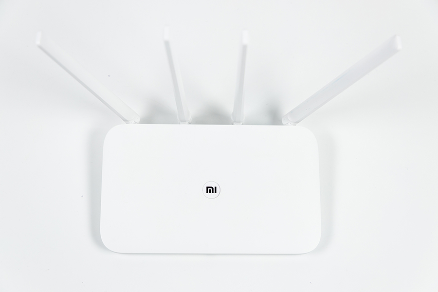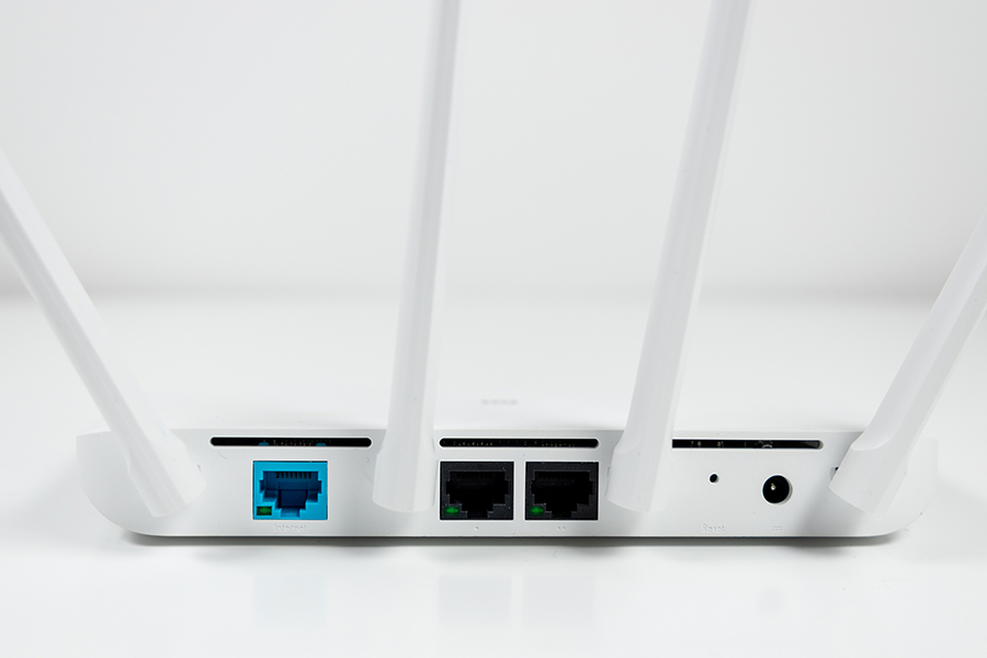 相比之下,小米路由器4的外型設計就比較傳統了,頂部配有MI字logo的MiNET快速接入按鈕,4根天線矗立在路由器后端,背面有一個藍色的千兆WAN口和兩個黑色千兆LAN口,以及電源接口和一個RESET按鈕,在占地面積上小米路由器4要比榮耀路由X2大上一些。