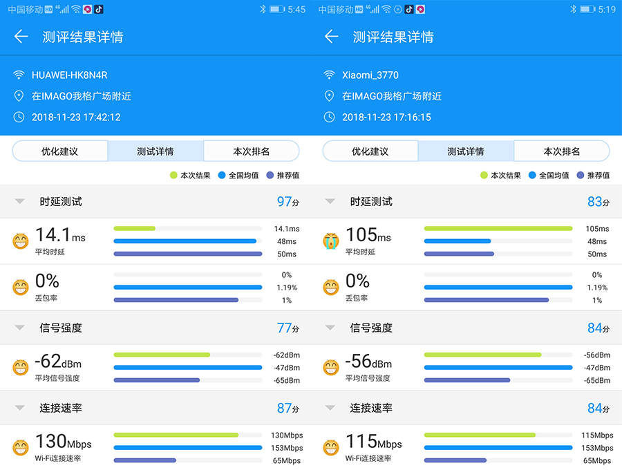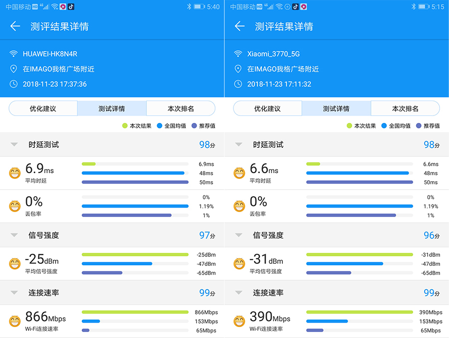 首先是在路由器附近時5GHz頻率下的測試,下圖為Wi-Fi評測大師的評測結果。(測試手機為榮耀Note10,左邊為榮耀路由X2,右邊是小米路由器4)