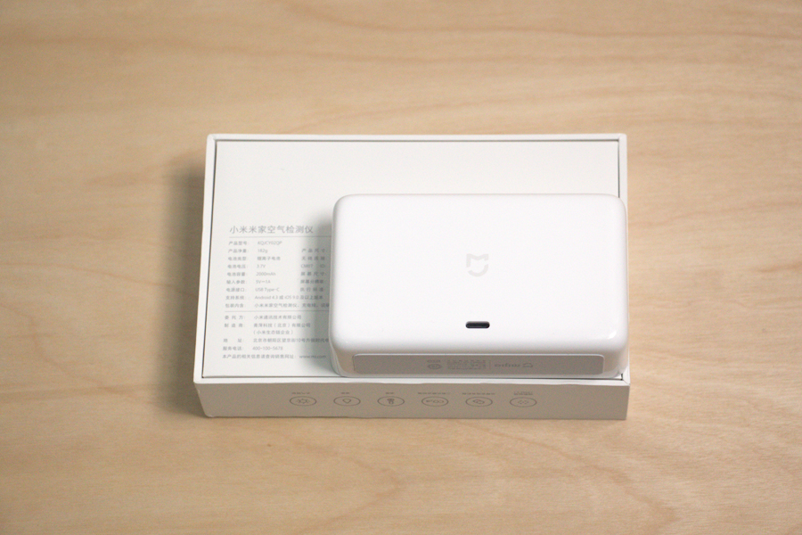 米家空氣檢測儀在包裝上依舊持續白色的主色調,除了正面logo和背面具體參數外,沒有明顯冗余的信息。方正的設計與乳白的顏色,給人一種可愛迷你的感覺。頂部左端布置了整機唯一的按鍵,用于開關與返回等操作。底部的防滑墊設計能使它在光滑的表面穩穩立住。