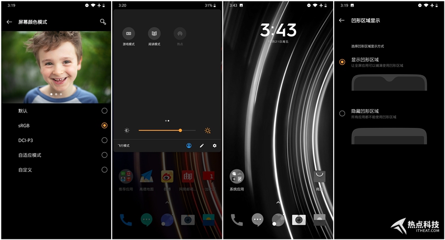 不過這塊屏幕的色準還不錯,說明一加對其調校是下了功夫的。在設置中,我們還可以很方便地進入sRGB、DCI-P3等顯示模式,在修圖時保證色彩統一。游戲模式、全局黑白的閱讀模式等方便功能也很實用,隱藏水滴劉海也是OLED屏的常規操作了。