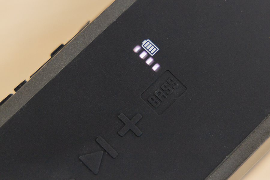 在BASS按鍵的上方還有個顯示電量的區域,在打開音箱后該區域便會顯示剩余電量的大致范圍。沒有插DC充電線時音箱滿電播放續航可連續播放約10小時,充電約3小時左右即可充滿。在打開音箱的同時,音箱的正面上方也會亮起一盞藍色指示燈。