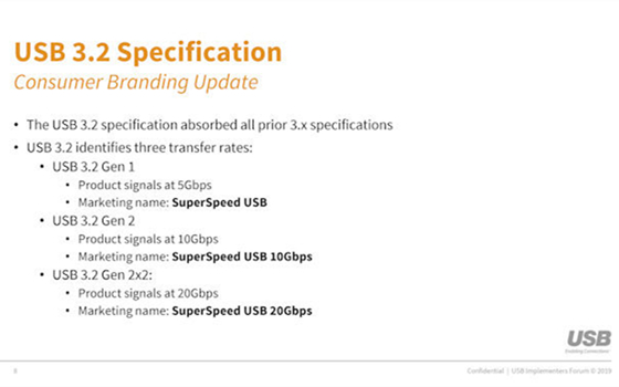 USB 3.2標準還進一步梳理了現有接口標準的命名,原本的USB 3.0、USB 3.1、USB 3.2被重新命名為USB 3.2 Gen 1、USB 3.2 Gen 2、USB 3.2 Gen 2x2。讀者朋友們一定要謹記這一點,等到新產品推出時千萬不要被廠商們的文字游戲擺一道。三者的速度也是呈倍數上漲,分別為5Gbps、10Gbps、和20Gbps。
