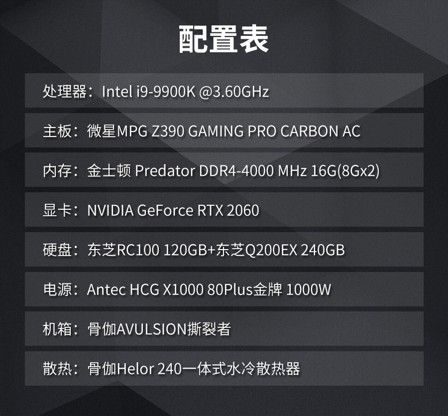 作為主打視覺效果的開放式機箱和RGB水冷散熱器,我們要看的自然就是裝機的實際效果了。本次裝機平臺的配置如下: