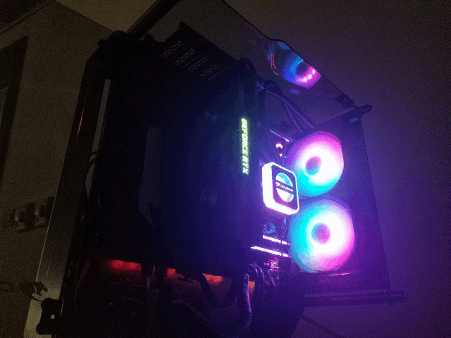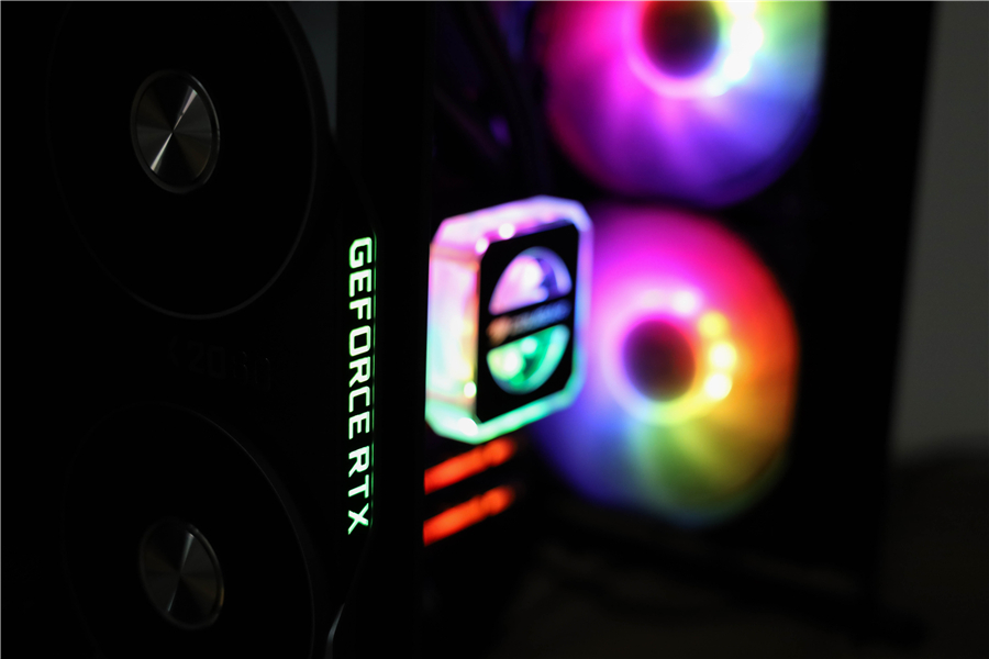 整機的燈光效果也非常驚艷。機箱、主板、散熱、顯卡、內存等各個部件的RGB通過控制盒連接成了一個整體,通過遙控器就能切換個性化場景。