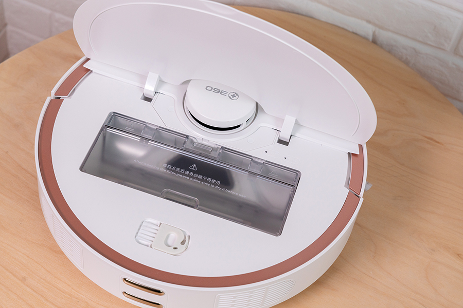 揭開S7主機的上蓋,我們可以看到有一個570ml容量的塵盒。這個塵盒采用HEPA濾網,并可拆卸清洗更換,將濾網晾干后便能投入下一次使用,并且還有一個小型的除塵刷放置在上蓋的內測區域,在清潔濾網可就地取材。