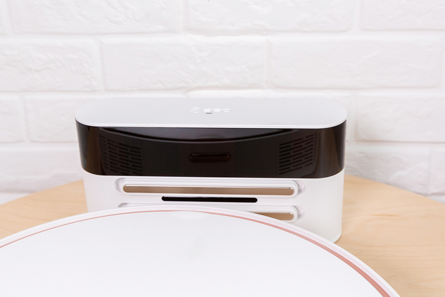 外觀造型上,S7與其它的掃地機器人并不明顯的區別,均為圓形的造型,并以白色為主色調,外圈輔以玫瑰金的顏色作為配色。掃地機器人主機正面凸起的圓柱帶有360的logo標記,下方就是LDS激光測距傳感器,有它專門負責掃地機器人的制定規劃路徑。在S7頂部的下方位置回充和電源兩個物理按鍵,主要還是靠手機APP來操控掃地機器人。