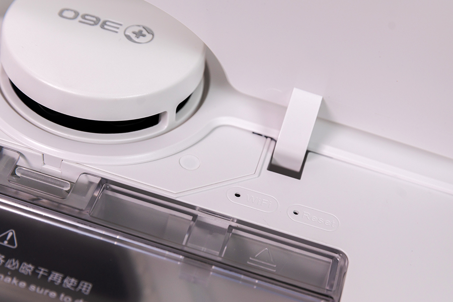 在濾網的右上角有WiFi和Reset兩個按鈕,通過WiFi按鈕我們就能通過手機的360智能APP將掃地機器人連上家里的WiFi網絡,實現APP的操控功能,Reset也好理解,就是重置還原默認狀態。