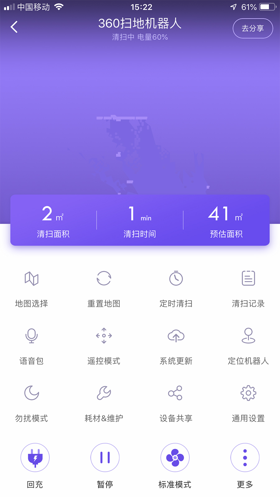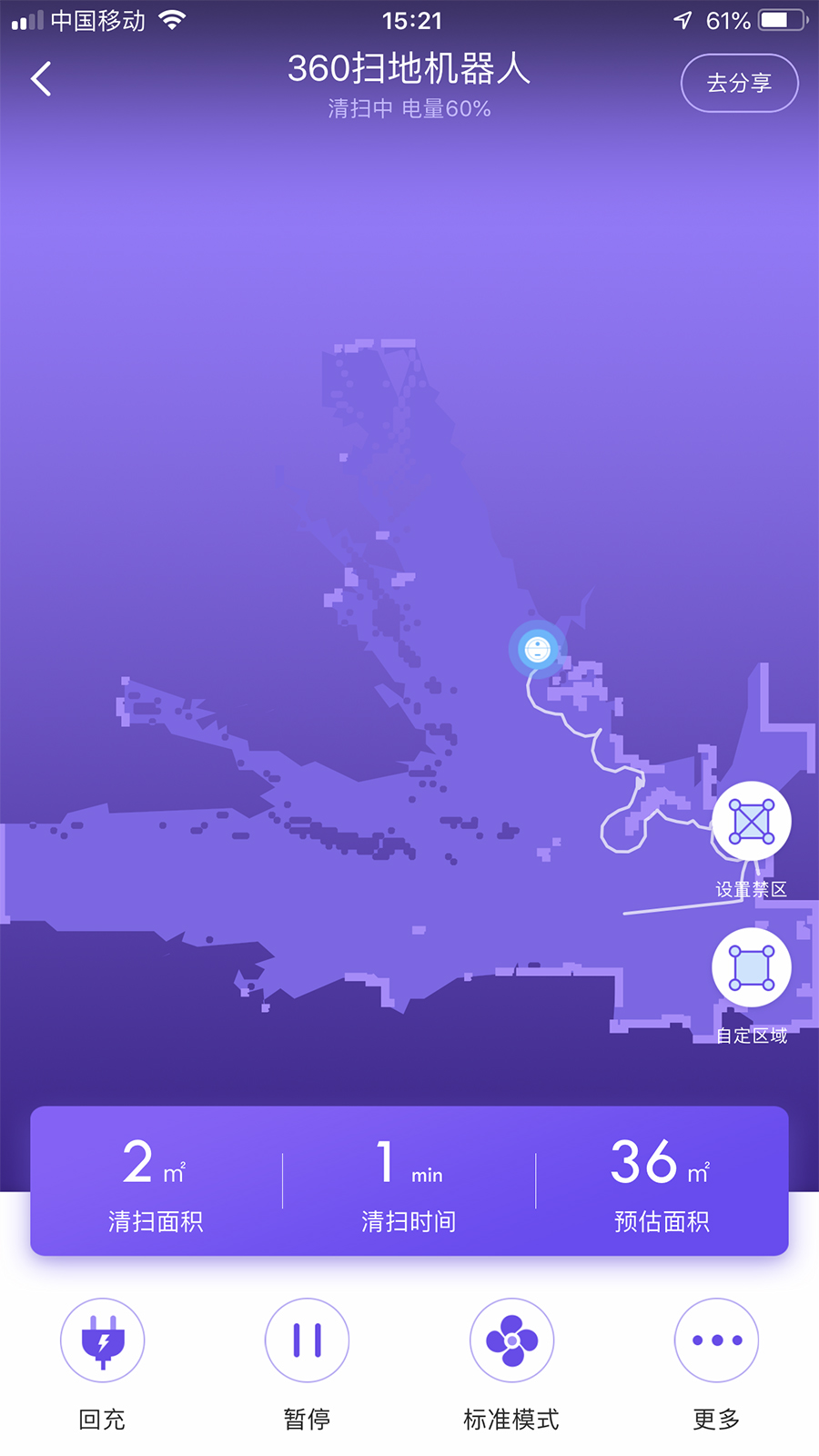 當然除了通過360智能這個APP啟動這臺掃地機器人進行自動清掃外,我們還可以手動遙控掃地機器人、設置相應的禁區、自定義清掃區域以及定時清掃進行個性化精細化的掃地清潔工作,可以說這個APP功能相當的豐富。