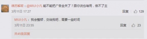 小米產(chǎn)品總監(jiān)、MIUI體驗總負責人@MIUI小凡在微博上征集大家對MIUI的反饋,其中就有網(wǎng)友提出了關閉廣告的相關內容,小凡回應稱會整頓,需要一些時間,但是他并沒有承諾完全關閉廣告。