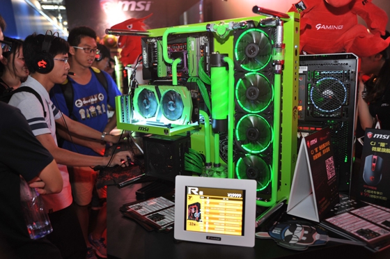 微星展臺上放置了多臺個性主機,其中這臺名為棲息地的MOD主機,便由頂級配件組成。主機整體以綠色為主色調,從底座、燈光,再到水冷液,無不讓人感到酷炫。