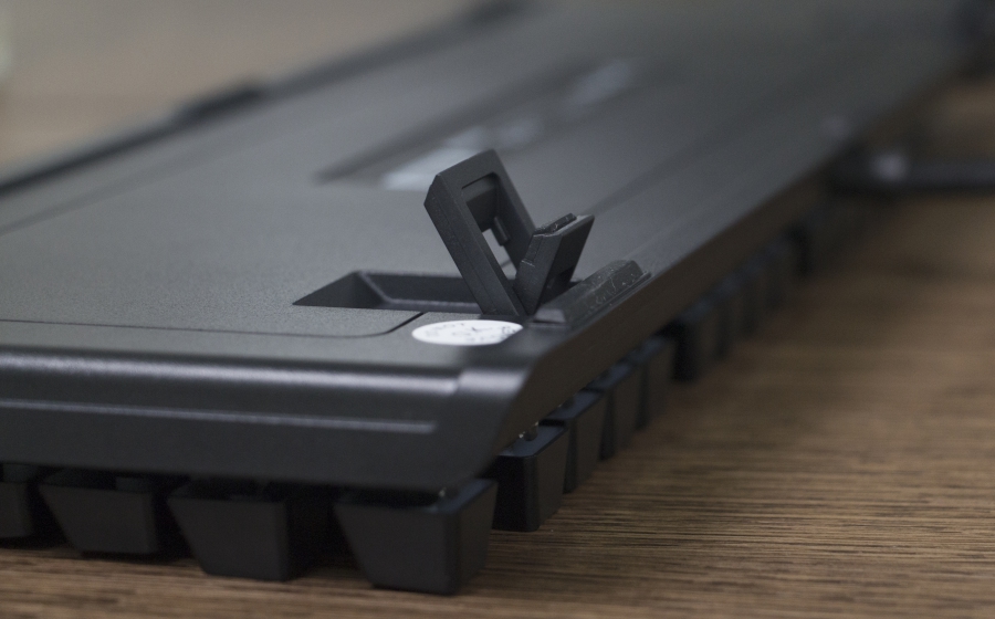 鈦度TKM600X的背面設(shè)計(jì)屬于實(shí)用型,在鍵盤背部上下兩端分別排布三個(gè)防滑腳墊,讓其在光滑的桌面上也可以具有很好的穩(wěn)定性。另外,鍵盤底部設(shè)置了兩個(gè)支撐腳架,腳架為兩段式結(jié)構(gòu),可以拓寬更多的應(yīng)用場(chǎng)景同時(shí)也滿足了用戶使用不同的需求。