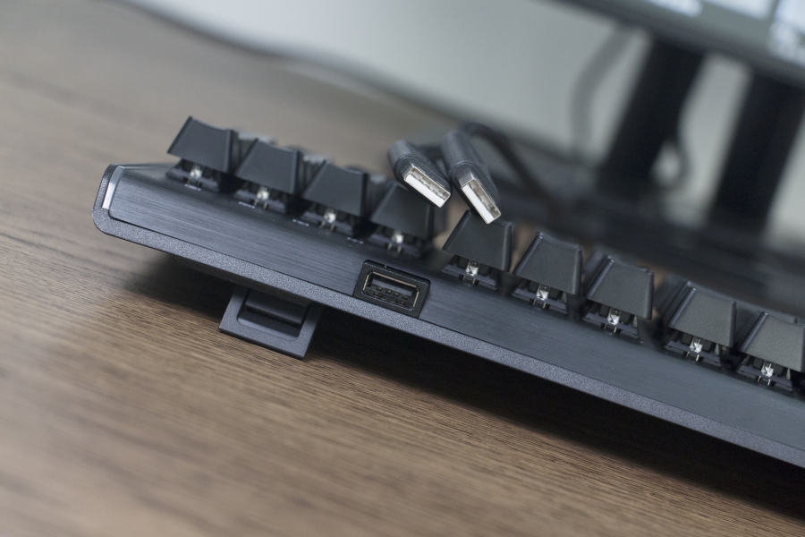 線材方面,鈦度TKM600X與多數(shù)機(jī)械鍵盤相同采用的是尼龍編織線,長(zhǎng)度大約在1.8m左右,這個(gè)長(zhǎng)度基本可以滿足各個(gè)使用場(chǎng)景。TKM600X有兩個(gè)USB-A接頭,一個(gè)是為鍵盤供電,另一個(gè)為USB擴(kuò)展接口供電。這個(gè)USB擴(kuò)展接口集成在鍵盤頂部右半部分,可以用來為設(shè)備供電以及數(shù)據(jù)傳輸。