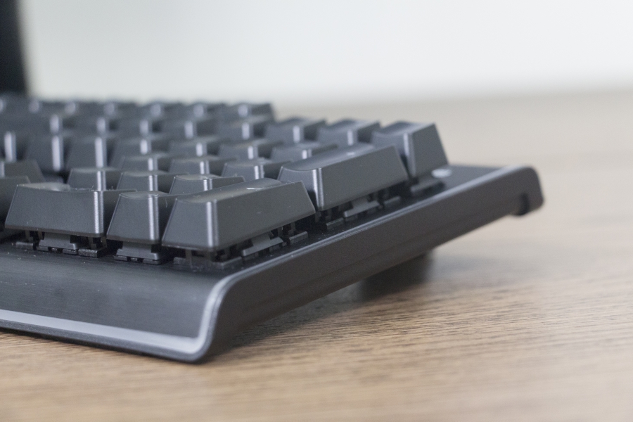 TKM600X的按鍵采用了懸浮式軸設(shè)計(jì),也就是俗稱的無上蓋設(shè)計(jì),比較易于日常清理。鍵帽采用類膚材質(zhì),手感相比傳統(tǒng)鍵盤要順滑許多,鍵帽字符采用激光雕刻,在保證透光性均勻的同時(shí)也保證了不易于磨損。
