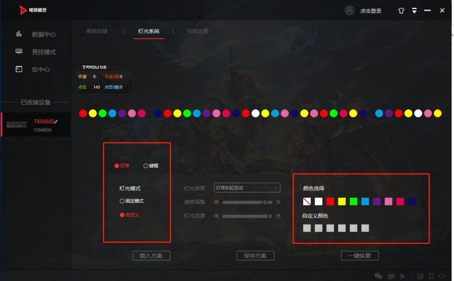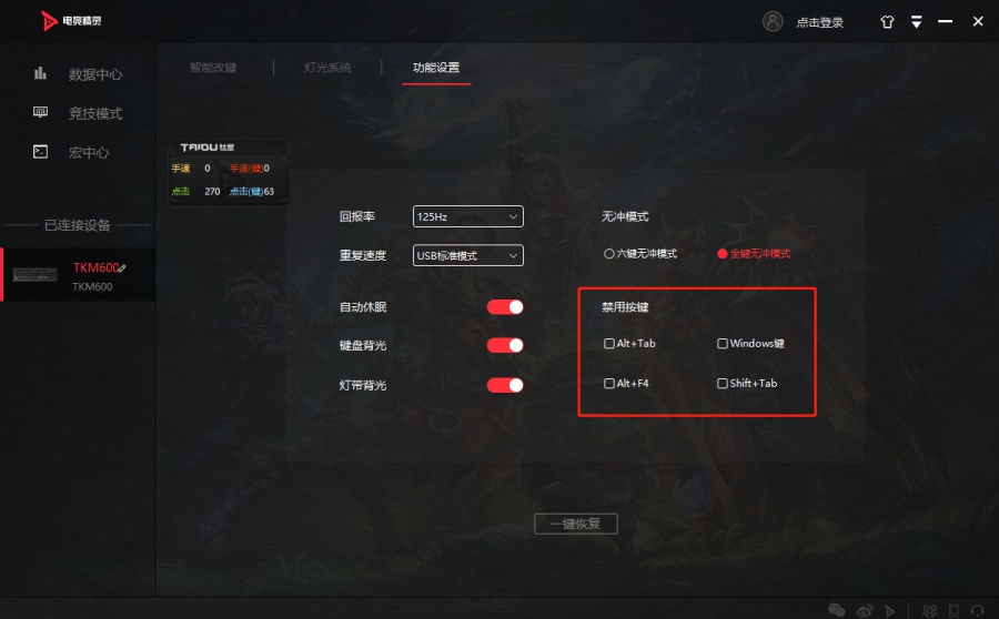 此外,鈦度TKM600X也可以通過官方配套的軟件《電競(jìng)精靈》來根據(jù)自己的喜好自定義每一個(gè)按鍵的燈光效果以及功能。