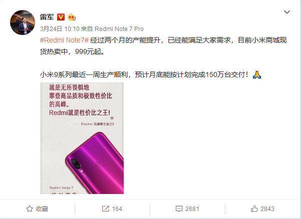 對(duì)于小米手機(jī)的產(chǎn)能和備貨問(wèn)題,雷軍在昨天上午(3月24日)再次在微博上發(fā)聲,他強(qiáng)調(diào)“Redmi Note 7經(jīng)過(guò)兩個(gè)月的產(chǎn)能提升,已經(jīng)能滿足大家需求,目前小米商城現(xiàn)貨熱賣(mài)中。”
