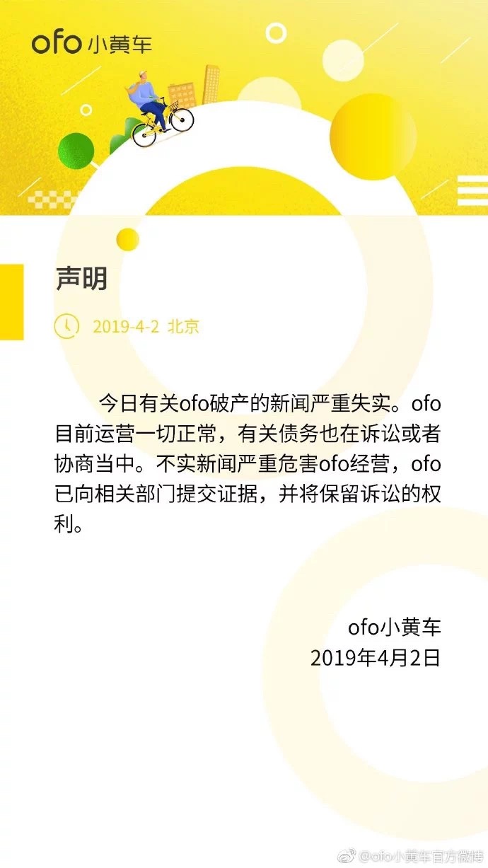 4月2日,各大媒體都傳出了ofo現(xiàn)身全國破產(chǎn)網(wǎng)的消息。對此,ofo發(fā)布聲明稱,有關(guān)ofo破產(chǎn)的新聞嚴(yán)重失實(shí),目前運(yùn)營一切正常,有關(guān)債務(wù)也在訴訟或者協(xié)商中。不實(shí)新聞嚴(yán)重危害了ofo經(jīng)營,ofo已向相關(guān)部門提交證據(jù),并將保留訴訟的權(quán)利。
