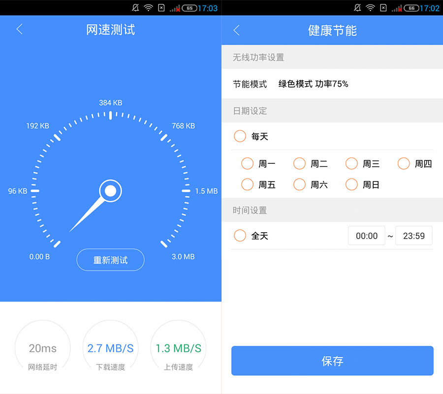 接下來我們看到了斐訊專為用戶提供了一項“健康節能”功能,用戶可根據自己的作息時間,以及無線網絡的使用時間來設置K1,為自己定制一個屬于自己的節能時間表。