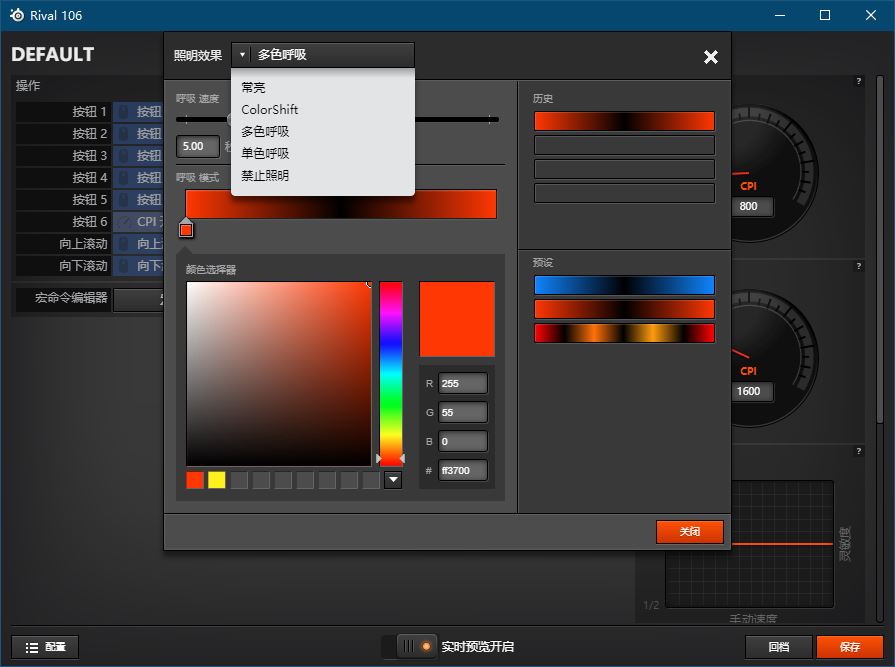 通過賽睿官網(wǎng)下載SteelSeries Engine 3驅(qū)動軟件,可以對鼠標(biāo)表面logo處RGB燈光顏色進(jìn)行調(diào)節(jié),還可設(shè)置常亮、ColorShift、多色呼吸、單色呼吸等四種照明效果。除此之外,通過該軟件還以對鼠標(biāo)主體按鍵添加功能設(shè)置,同時可對鼠標(biāo)的靈敏度、加速度、巡檢速率進(jìn)行修改調(diào)節(jié)。