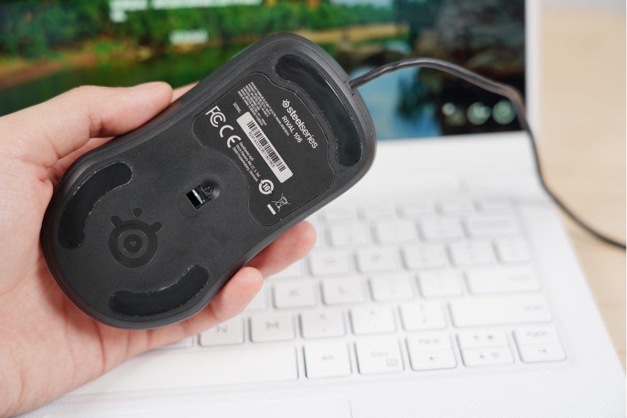底部設(shè)計則十分簡潔,延用賽睿傳統(tǒng)的底盤設(shè)計,中心位置安放一枚方位傳感器,在底面上部以及下部左右兩側(cè)各分置一條大面積的滑面腳貼,可以為其提供較強(qiáng)穩(wěn)定性的同時帶來了不俗的拖動體驗。需要注意的是,Rival 106出廠時腳貼上覆蓋有一層塑料保護(hù)膜,在正式使用時記得撕下貼膜,以免影響使用體驗。