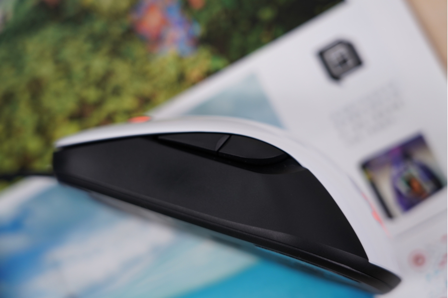鼠標(biāo)通體采用黑白兩種配色,頂部覆蓋一層鏡面白色外殼,鏡面提供了順滑的手感,白色解決指紋凸顯問題。鼠標(biāo)左右兩側(cè)均采用了磨砂工藝處理,手指與其接觸時觸感細(xì)膩柔滑。在尾部中心位置,有一個顯眼的“賽睿”logo,logo表面加入了透光處理,其內(nèi)置支持1680萬色RGB燈光。